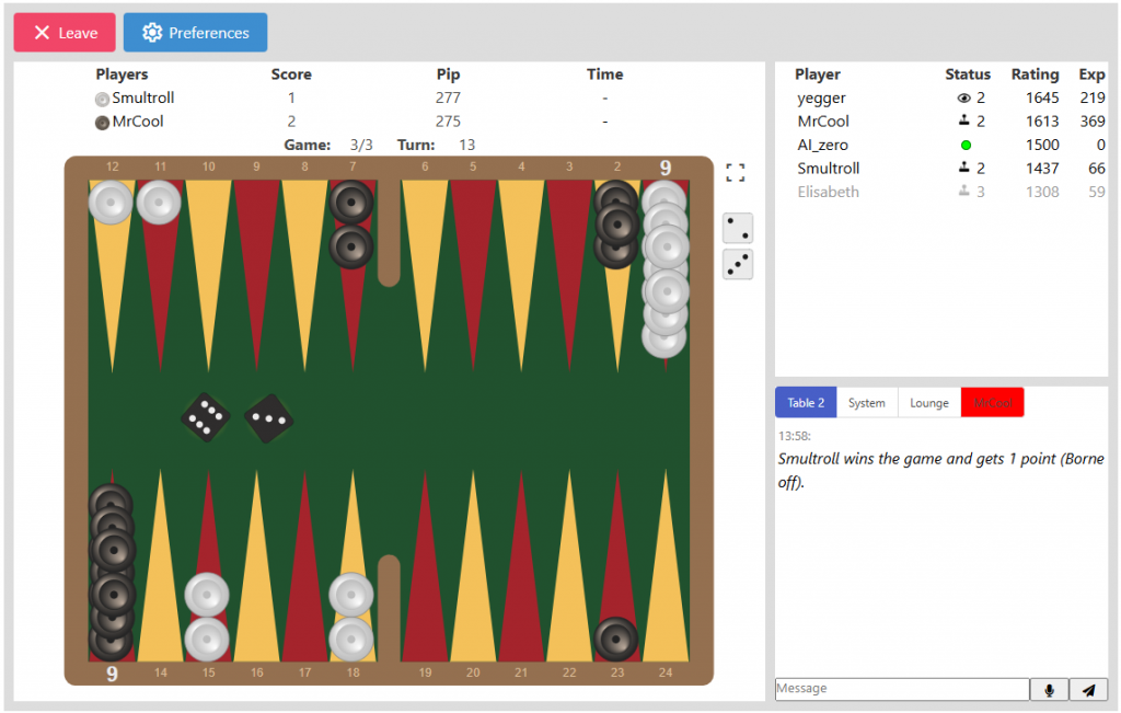 - Rating-systemet bygger på Elo-systemet som används inom t ex backgammon och schack. Nya spelare börjar med 1500 poäng i rating, och efter varje rating-grundande match justeras ratingen upp vid vinst och ned vid förlust. Storleken på justeringen beror på skillnaden i rating mellan spelarna, samt hur många partier matchen spelades om (matcher om fler partier påverkar ratingen mer). För varje period av 3 månaders inaktivitet (ingen rating-grundande match spelad) dras 10 inaktivitets-poäng, dock som mest ner till 1500 poäng.